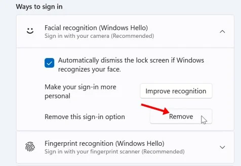 Steps to remove facial recognition (Windows Hello)