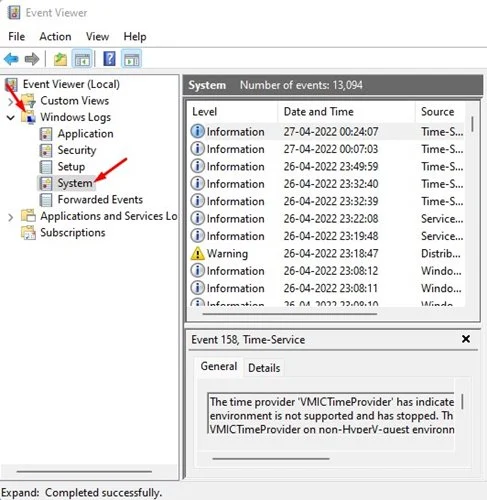 2. In Event Viewer, go to the Windows> System logs.