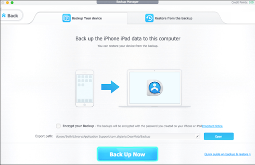 On DearMob, click Backup, then Back Up Now to make a full backup of all iPhone files.